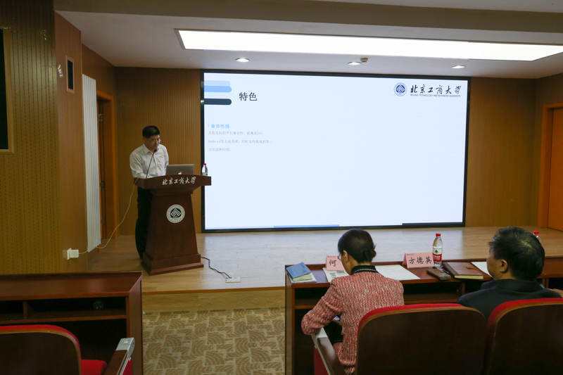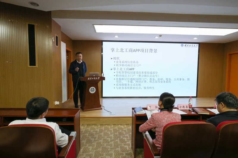 張長恒從產品特色、涵蓋應用、主要功能、功能展示等四方面介紹了掌上北工商APP的功能。他提到,APP具備兼容性強、操作便捷、服務同步更新、精細化管理、功能全面且可擴展性強等特點,涵蓋了故障報修、調查問卷、一卡通服務、圖書館預約等22個公共應用模塊,科研信息、財務查詢、一周會議、郵箱等4個教職工應用模塊和成績、校醫(yī)院報銷預約2個學生應用模塊。他向與會人員演示了APP主要應用的使用,并對其中校園新聞、通知、餐飲點評、校車、調查問卷、故障報修、圖書館、網絡計費、投票、課程表/成績查詢等功能進行了詳細說明。