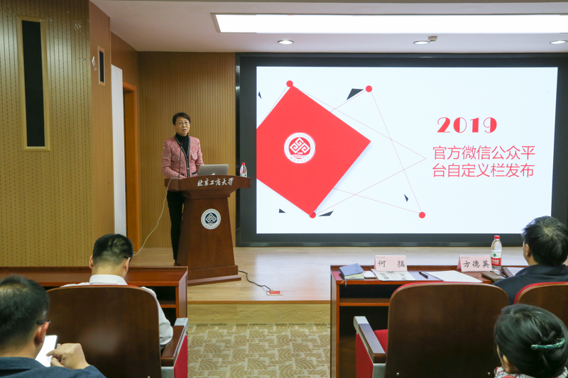 何猛從官方微信公眾平臺的運營情況、自定義欄開發(fā)和使用三個方面介紹了官方微信自定義欄上線情況。她提到,官方微信公眾平臺自2015年1月7日開通以來,始終秉持發(fā)布傳播權威校園信息、展示呈現校園風采、服務溝通廣大師生校友的宗旨,共發(fā)布圖文1062期,吸引35066人關注,已經成為學校重要的信息傳播渠道、宣傳思想文化陣地和高校文化育人工作的重要載體。為解決運營過程中發(fā)現的實際問題,經過廣泛調研和分析,黨委宣傳部聯合信息網絡中心推出官微自定義欄項目。自定義欄設置“微資訊”“微招生”“微服務”三個板塊, 包含“微主頁”、“微校歷”、“微校園”、“學校微博”、“本科招生網”、“網上高招辦”、“微信矩陣”、“掌上北工商”等內容。她表示,官微將進一步建章立制,做好內容深耕,強化互動服務,注重創(chuàng)新突破,為學校“智慧校園”的建設貢獻力量,為學校“雙一流”建設營造良好輿論氛圍。