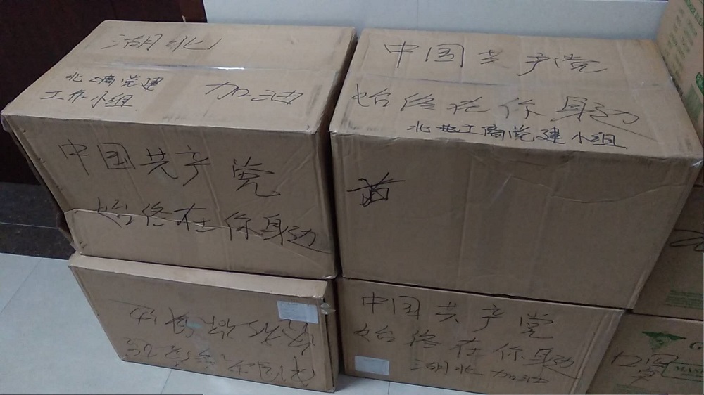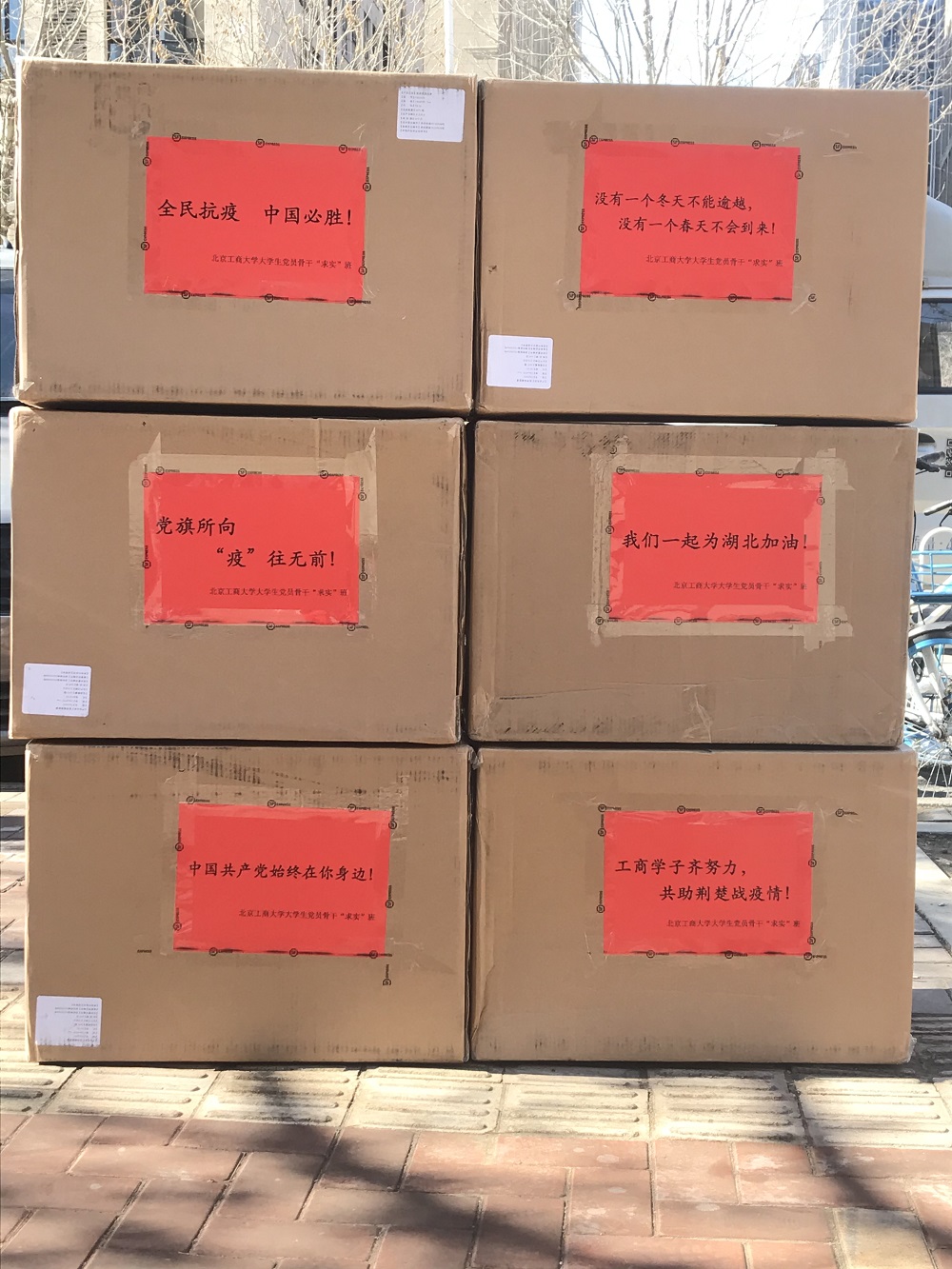 “中國共產黨始終在你身邊!”“工商學子齊努力,共助荊楚戰疫情!”“黨旗所向 疫往無前”“與國同心 共克時艱”一句句帶著黨徽光芒,帶著北工商青年大學生愛國溫度的祝福語伴隨著物資直抵湖北一線。湖北荊州市公安縣人民醫院的領導表示“看到這樣充滿正能量的加油標語,感受到了北京工商大學黨員同學同志式的關心,也給一線醫務工作者增添了信心和力量!對參與此次募捐活動的黨員同學表示衷心的感謝!對北京工商大學表示由衷的敬意!”恩施土家族自治州湖北民族大學附屬民大醫院專程發來的接收函中表示“你們的善舉是對此時此刻奮戰在一線的醫務人員最大的鼓舞和支持,讓我們信心倍增。感謝你們對白衣戰士的親情和關愛,并致以崇高的敬意!”