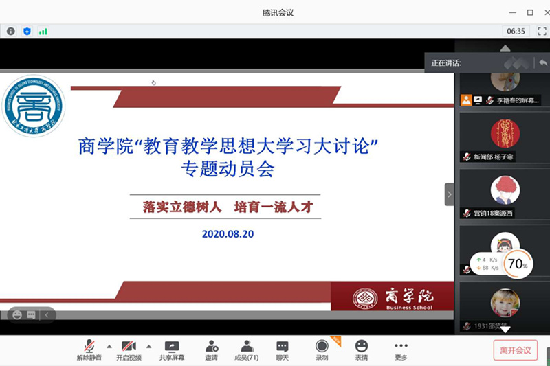 商學院于8月17日、20日召開兩場主題為“落實立德樹人,培育一流人才”的線上“教育教學思想大學習大討論”專題動員會議,累計150余名師生參加動員會議。學院黨委副書記張倩,全體輔導員、本研學生黨支部書記、團學干部、各班骨干等參加此次會議。會議由團委書記李艷春主持。
