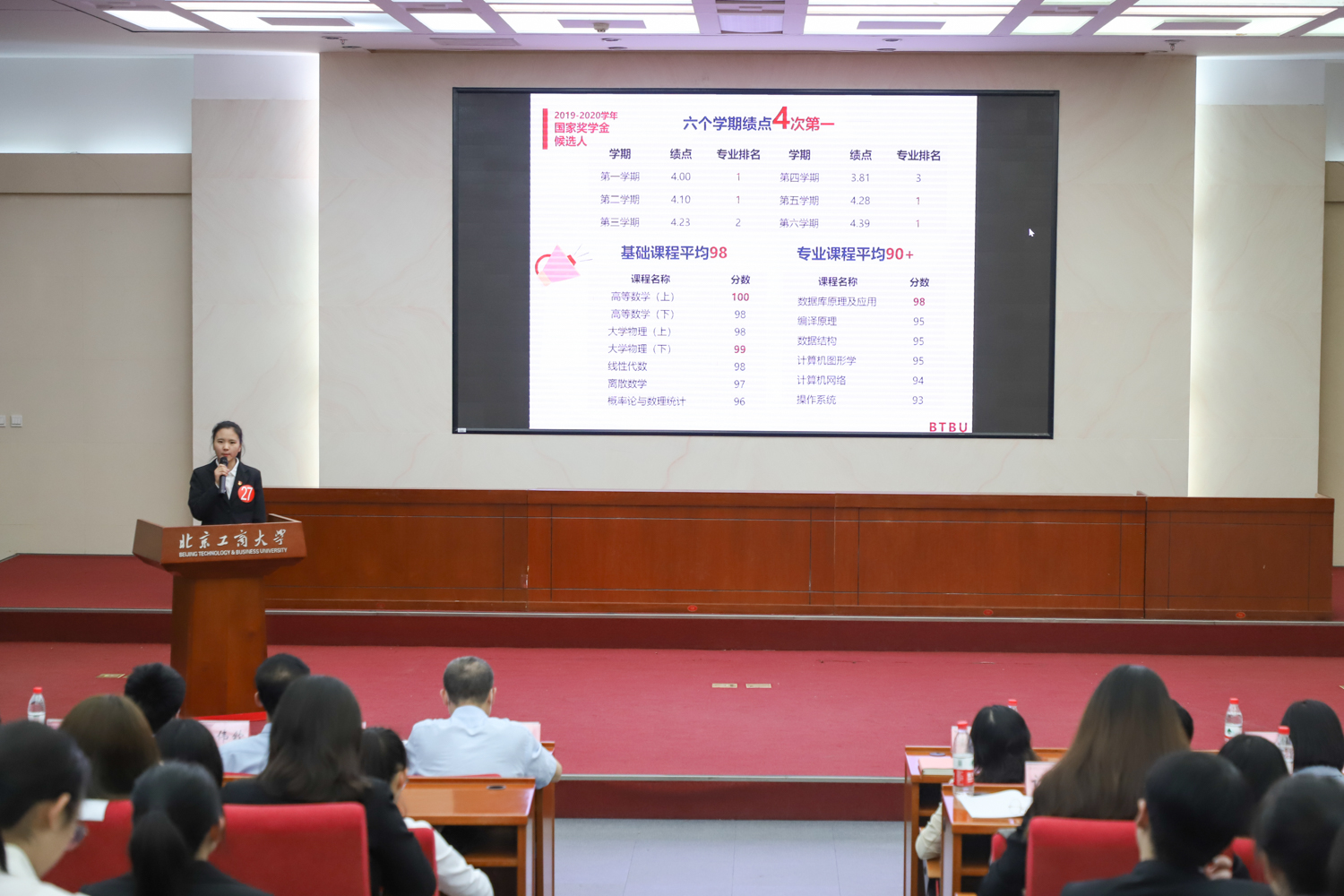 評審會在莊嚴(yán)的國歌聲中開幕。來自14個學(xué)院的27名國家獎學(xué)金候選人按照抽簽順序依次上臺,通過210秒的文稿演示展示自己在學(xué)習(xí)、科研、學(xué)生工作、社會實(shí)踐、競賽獲獎、志愿服務(wù)等方面取得的成績。數(shù)學(xué)與統(tǒng)計學(xué)院杜芳芳17門專業(yè)課在98分以上,其中7門專業(yè)課達(dá)到滿分,獲得全國數(shù)學(xué)競賽二等獎等市級以上獎項(xiàng)9項(xiàng),參與北京市課題2項(xiàng);食品與健康學(xué)院賈丁瑋作為國家級大創(chuàng)科研項(xiàng)目負(fù)責(zé)人,論文現(xiàn)已發(fā)表于CDCD,北大核心期刊;輕工科學(xué)技術(shù)學(xué)院段琦積極參與學(xué)科競賽并獲得化工設(shè)計大賽全國二等獎、美國數(shù)學(xué)建模比賽三等獎、省部級獎4項(xiàng);化學(xué)與材料工程學(xué)院魏詩藝積極進(jìn)取,勇于科研創(chuàng)新,現(xiàn)已發(fā)表核心期刊論文2篇,并獲得山東大學(xué)、中國科學(xué)院大學(xué)等6所高校的面試邀請和擬錄取資格;生態(tài)環(huán)境學(xué)院石巖喆帶領(lǐng)團(tuán)隊申請到國家級大創(chuàng)項(xiàng)目,獲寒假返鄉(xiāng)調(diào)研三等獎;人工智能學(xué)院肖芷瑄作為資深天文愛好者,參與多項(xiàng)天文相關(guān)志愿活動,作為國家級大創(chuàng)項(xiàng)目成員,參與一項(xiàng)新專利的研究開發(fā);計算機(jī)學(xué)院李文靜和班委們共同努力,帶領(lǐng)班級四級通過率89.7%,被評為校級先進(jìn)班集體;經(jīng)濟(jì)學(xué)院陳希陽學(xué)習(xí)實(shí)踐兩手抓,績點(diǎn)綜測連續(xù)三年雙第一,發(fā)表一篇CSSCI,市場調(diào)查與分析大賽全國一等獎;商學(xué)院楊億慧累計獲得國家級、省部級和校級獎項(xiàng)60余項(xiàng),發(fā)表論文4篇;電商與物流學(xué)院李佳麗作為學(xué)業(yè)輔導(dǎo)組織“商夢花開”總負(fù)責(zé)人,開設(shè)高數(shù)課程輔導(dǎo),疫情期間帶領(lǐng)團(tuán)隊籌劃組織“停課不停學(xué)”系列課程,戰(zhàn)“疫”故事被多家主流媒體轉(zhuǎn)載,校內(nèi)外反響強(qiáng)烈;法學(xué)院王雪溪憑著對法律的熱愛,積極參加憲法演講比賽和模擬法庭競賽并創(chuàng)多項(xiàng)佳績;外國語學(xué)院劉花榮作為校學(xué)生資助宣傳大使多次參與河北蔚縣桃花中學(xué)、南關(guān)希望中學(xué)、良鄉(xiāng)五中、腦癱患者等支教活動,幫助人數(shù)達(dá)200余人;傳媒與設(shè)計學(xué)院張思諾綜合素質(zhì)優(yōu)秀,蟬聯(lián)校優(yōu)秀學(xué)生一等獎學(xué)金,跨學(xué)科與團(tuán)隊協(xié)作斬獲美國大學(xué)生數(shù)學(xué)建模競賽S獎,并獲得《中國青年報》優(yōu)秀駐校記者、北工商建校70周年校歌創(chuàng)作大賽二等獎等多項(xiàng)榮譽(yù),候選人的優(yōu)秀事跡贏得了現(xiàn)場評委、老師同學(xué)們熱烈的掌聲。