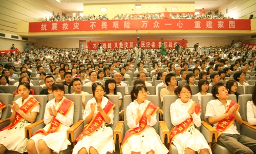 6月13日上午,抗震救災(zāi)英模事跡報(bào)告團(tuán)走進(jìn)我校,6位英模動(dòng)情的講述,為1000名師生再現(xiàn)了地震時(shí)驚心動(dòng)魄的場(chǎng)面和各界群眾萬(wàn)眾一心、眾志成城抗震救災(zāi)的感人事跡?,F(xiàn)場(chǎng),眾多師生因?yàn)楦袆?dòng)而落淚。