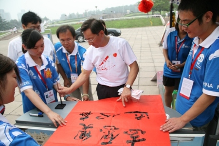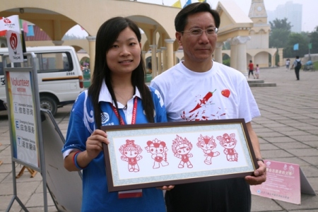 在石景山游樂園服務(wù)站點(diǎn),嘉華學(xué)院志愿者將自己精心制作的奧運(yùn)“福娃”的剪紙作為禮物送給謝副校長。謝副校長為志愿者們寫下了“志愿奧運(yùn),心存高遠(yuǎn)”八個(gè)字。