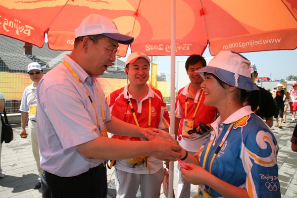劉劍部長每經(jīng)過一處,都親切地與志愿者們交談,贊揚他們的工作,鼓勵他們繼續(xù)努力,并詢問、了解他們在工作、生活中遇到的困難。在烈日下服務的志愿者們見到劉劍部長親自來到賽場看望他們并親手贈送給他們小紀念品,都非常感動,并紛紛表示會以自己的實際行動服務好奧運會和殘奧會。劉劍部長首先慰問了醫(yī)療業(yè)務口的志愿者,對于他們成功搶救南非教練的事跡大加贊賞,并提醒志愿者們要注意身體;在觀眾座席入口,劉劍部長與正在工作的觀眾服務志愿者一一握手,為每位志愿者送上了小禮物,在詳細詢問了服務的具體情況之后,劉劍部長由衷感嘆“工商大學的志愿者真的很棒,你們?yōu)閵W運會爭光了”;在觀眾安檢入口,劉劍部長對觀眾服務業(yè)務口的志愿者們給予了特別關(guān)注,當劉劍部長到達時,觀眾服務業(yè)務口的志愿者們正在列隊唱著歌曲《北京歡迎你》歡送觀眾退場,他們看到劉劍部長到來便很熱情地給予了他“愛的鼓勵”,劉劍部長和志愿者們一一握手,并對他們說:“你們真的很棒,你們的出色工作贏得了各界好評,希望殘奧會時我們一起努力,做到更好!”劉劍部長還看到了志愿者們在崗位上熱情服務、微笑奉獻,有的志愿者嗓子喊啞了,有的志愿者在太陽下暴曬,但他們依然以燦爛的微笑、飽滿的熱情服務觀眾,他將紀念品送給在崗的志愿者,并親手為志愿者們佩戴上了微笑圈。在崗的志愿者中有一部分是來自浙江省的,劉劍部長得知他們遠道而來時說:“非常感謝你們,希望你們在快樂中體驗,把我的問候帶給你們家鄉(xiāng)的人們。” 劉劍部長對老山場館志愿者的關(guān)懷溫暖著每一名志愿者,凡是他到過的地方,他都沒有漏掉對任何一名志愿者的關(guān)心,他親切慰問,并囑咐志愿者們天氣熱要多喝水,現(xiàn)在高高興興地當志愿者,將來在日常生活中也爭當志愿者。