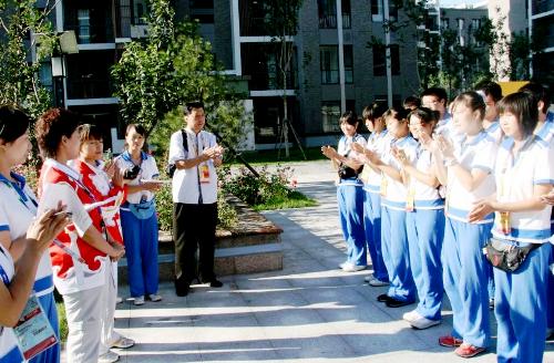 8月31日,萬里無云,陽光明媚,在帶隊老師郭建榮和傅磊的帶領(lǐng)下,我校41名殘奧村服務(wù)生懷著對服務(wù)殘奧會無限的憧憬和榮光來到了由中國石油陽光酒店集團(tuán)負(fù)責(zé)的D1樓,準(zhǔn)備開始他們?yōu)槠谝粋€月的殘奧村住宿服務(wù)工作。中油陽光酒店集團(tuán)奧運(yùn)村(殘奧村)執(zhí)行副總經(jīng)理助理鄭靜與D1樓樓長高立新以及全體D1樓員工一起,為我校服務(wù)生舉行了簡短的歡迎儀式。