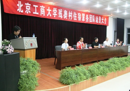 隨后,全體服務生在帶隊老師于沛帶領下,舉起右手,莊嚴宣誓:“我們要團結一致、振奮精神、忠于職守、不負重托……”。這誓言表達著我們北工商服務生們奉獻殘奧的堅定決心!