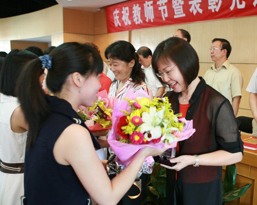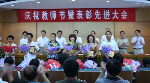 隨后,校黨委副書記盧思鋒宣讀學校表彰決定。副校長孫寶國、李朝鮮、王尚忠宣讀了我校各級先進集體、先進個人名單。副校長張耘宣讀了從教滿30年教職工名單。頒獎儀式在北京奧運會頒獎音樂中進行,獲獎者臉上的笑容與手中的鮮花相互映襯,顯得格外燦爛。音樂與掌聲交融,現場氣氛達到了高潮。