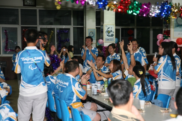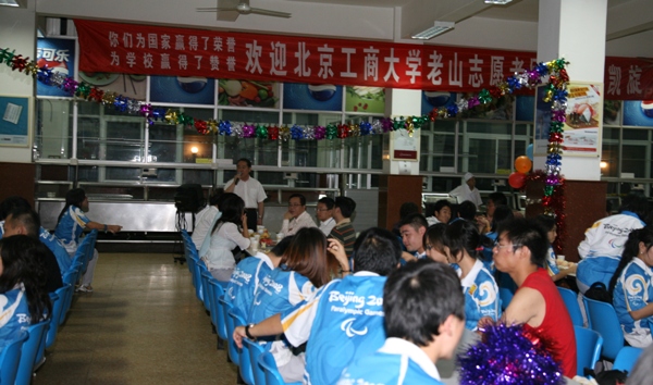 9月10號17:00,隨著殘奧會場地自行車比賽的結束,我校329名老山自行車場館群殘奧會志愿者圓滿完成老山自行車場館群殘奧會的賽時志愿服務工作,并于18:00以后陸續凱旋歸來。至此,經過了近兩個半月的奮戰,我校志愿者圓滿完成了老山自行車場館群的奧運會和殘奧會的志愿者服務任務,他們以優質的服務、迷人的微笑為國家贏得了榮譽、為學校贏得了贊譽。為歡迎我校老山志愿者團隊光榮凱旋,晚上6:30,我校奧運籌辦與賽時保障指揮部為全體賽會志愿者準備了慶功宴。校黨委書記孫堯東、副書記盧思鋒、浙江團省委副書記徐旭、后勤處飲食服務中心主任曹潞生以及校團委書記呂素香等領導到會與志愿者們進行了聯歡。浙江省殘奧服務團也應邀參加了宴會。