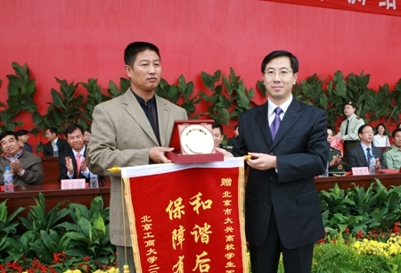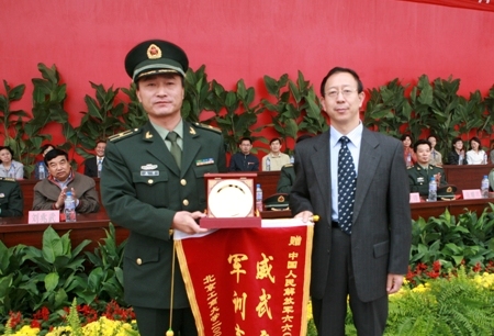 10月18日上午,我校2008級本科學生軍訓結訓典禮在大興高校學生軍訓基地舉行。校領導譚向勇、盧思鋒、孫寶國、王尚忠出席結訓典禮。應邀出席典禮的還有北京市軍訓辦主任張培松大校,北京市教委體美處副處長劉兆武,國防大學戰略部大學生軍訓教研室主任霍鳳鳴大校,大興區武裝部政委張耀邦大校,66081部隊副參謀長李翔中校,軍訓團團長龐誼少校,學生家長代表、中央辦公廳調研局局長徐宏源。