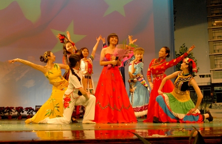 “五十六個民族,五十六枝花;五十六族兄弟姐妹是一家…”熟悉的旋律又一次縈繞耳邊,熟悉的感覺又一次激蕩胸懷.每一個音符,都詮釋著中華民族的友愛.身著各組民族服飾的舞者們輕盈躍動,和著明快的歌聲,舞出了民族的團(tuán)結(jié),舞出了民族的和諧,更舞出了校園中的和諧音符。
