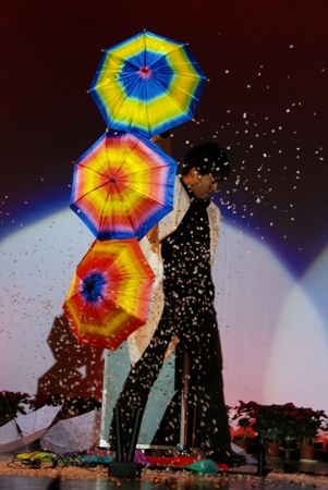 燈光變暗,舞臺中央一把把飛舞的小傘猶如一個個輕盈的精靈,將我們引入魔幻的世界.魔術(shù)的神秘與精彩隨著表演者靈活的手指展現(xiàn)在觀眾面前.絢麗的彩綢﹑繁雜的撲克與一把把張開的傘面交織出魔幻的夢境,也編制出一個個活潑靈動的“傘魂”!這是自廣告08班李其倫同學(xué)帶來的精彩魔術(shù)表演《夢·傘魂》,該魔術(shù)曾獲第二屆歡樂谷國際魔術(shù)節(jié)暨首屆歡樂谷魔術(shù)大賽銀獎。這是師生表演的節(jié)目中最具專業(yè)色彩的節(jié)目,似乎預(yù)示著我校的各項工作將更加專業(yè)化。