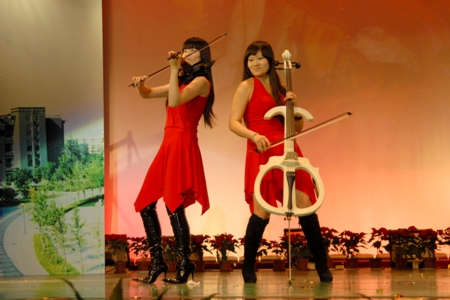 “火焰組合”憑借著青春的吸引,夢想的力量為臺下的觀眾帶來了一場提琴“風(fēng)暴”。鮮紅的服裝,優(yōu)雅的提琴,動感的樂曲,這一切都讓恰逢少年的同學(xué)們能接受了一次音樂“風(fēng)暴”的洗禮,現(xiàn)場的氣氛和著音樂舞動。她們是來自中國電影廣播樂團(tuán)的青春組合。