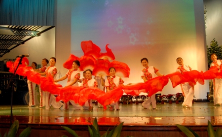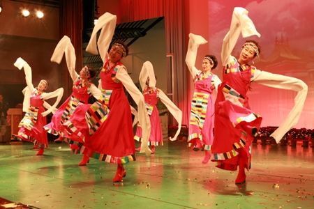隨后,由我校退休老干部組成的,一支平均年齡為58歲的舞蹈隊為觀眾帶來了極具藏族風(fēng)情的舞蹈<<吉祥謠>>。襯著布達(dá)拉宮的照片,輕靈飛揚(yáng)的水袖展現(xiàn)出老干部們?nèi)缒贻p人一樣的活力與激情。她們的一招一式都顯得那么動人,那么吉祥如意。