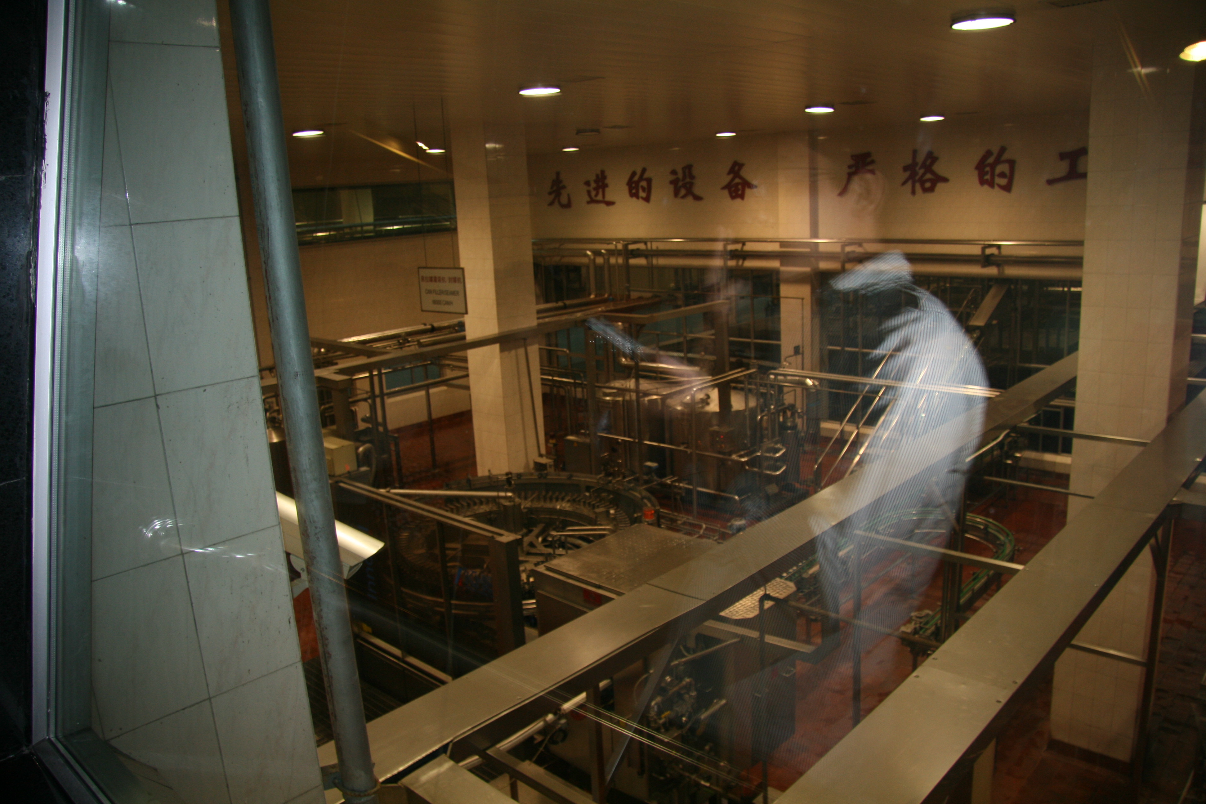 一進門就看見了為紀念申奧成功的易拉罐裝拼成的巨型雕塑。隨后同學們在工作人員的帶領下來到了可口可樂生產車間。盡管只能隔著一層玻璃觀察可樂生產的過程,但對于第一次看到這樣全自動化生產的先進科學技術,同學們還是興奮不已。“塑膠瓶裝線是每分鐘四百瓶,易拉罐是每分鐘一千一百罐?!惫ぷ魅藛T的講解令同學們嘆為觀止。
