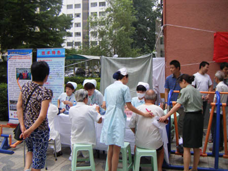 這次的便民服務活動,還邀請了解放軍總院第一附屬醫院(304醫院)心血管病中心來西家屬區義診,這也是心血管病中心第一次走進社區。早上7點,40余名醫護人員就到達了活動現場,他們當中既有像王禹、沈東、徐國辰這樣的主任醫師、軍隊心血管專家,也有護士長、主管護士、護士,他們為居民提供心臟聽診、心電圖、測血糖、量血壓、量體重、心血管疾病預防咨詢等義診。儀器剛剛搬出,就診的居民就排起了長隊。為了讓等候就診的老年人減少站立排隊時間,細心的后勤同志協助醫生發號,讓老同志坐在樹蔭下候診。