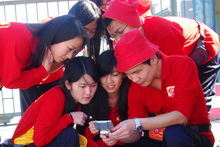 舞蹈隊(duì)的出發(fā)時(shí)間定在11點(diǎn)半,而這正式我校首都國(guó)慶群眾游行“艱苦創(chuàng)業(yè)”方隊(duì)經(jīng)過(guò)天安門(mén)的時(shí)間,同學(xué)們?cè)诩蠀^(qū)急切地想知道我校游行方陣的情況,情急之下,同學(xué)們拿出手機(jī),通過(guò)網(wǎng)絡(luò)電視觀看群眾游行方隊(duì)的盛況。在看到我校的學(xué)生簇?fù)碇ㄜ?chē)走過(guò)天安門(mén)廣場(chǎng)時(shí),大家不禁發(fā)出了陣陣歡呼。“太激動(dòng)了!”舞蹈隊(duì)的孫奇同學(xué)說(shuō)道:“看著他們從天安門(mén)前走過(guò),手舉花環(huán),感覺(jué)身體里熱血在沸騰!”舞蹈隊(duì)的崇小萌同學(xué)十分地興奮,“看到了他們的出色表現(xiàn),我也下定決心,要將自己最美麗的一面在天安門(mén)前展現(xiàn)!”澎湖同學(xué)也表示:“我們平時(shí)訓(xùn)練很緊張,在上周日剛剛增加了很多節(jié)目,都是這幾天趕練完的,今天一定不會(huì)出錯(cuò)!”
