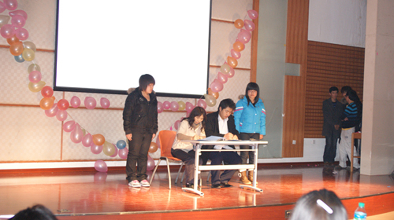11月26日晚外國語學院主辦的第三屆“友誼杯”英文才藝大賽決賽在良鄉校區學生活動中心舉行。外國語學院黨總支副書記楊秀萍、團總支書記鄭建高,美國教育中心北京市朝陽區留美語言培訓學校市場部經理郭德環和市場部培訓專員(我院09屆畢業生)祖玉卉,以及各院系學生會主席、全校觀看比賽的同學約150人參加。本次大賽邀請外國語學院英語系教師孔海龍、公共外語教學部教師劉紅等專業人士擔當評委。