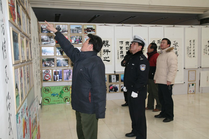 隨后,李希寶警官在保衛處頓勁松處長等人的陪同下來到學校圖書館大廳,參觀了我校最近在“安全教育宣傳實踐月”中舉辦的以交通、消防、治安綜合治理為主題的書畫、攝影作品展;查驗了我校在“安全教育宣傳實踐月”中的上交的362份“安全百題”安全知識競賽的答卷。