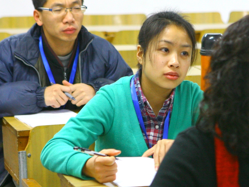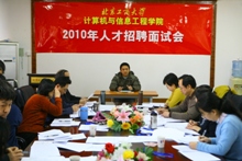 你可不要以為這是在國(guó)外某大學(xué),其實(shí)這是北京工商大學(xué)2010年教師招聘商學(xué)院面試組現(xiàn)場(chǎng)的一幕。當(dāng)面試官見應(yīng)聘者是位美國(guó)名校畢業(yè)的博士生時(shí),馬上改用英語提問。應(yīng)聘者也表現(xiàn)得十分機(jī)敏,立刻用純正的美語侃侃而談。一襲淺灰色正裝的她看起來十分干練。