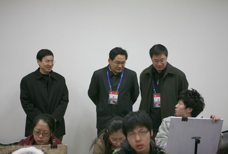張德玉和李朝鮮詢問了報名人數、考試安排,查看了考場并慰問了現場負責考務的老師。招生辦老師向到場的學校領導匯報了考生考試情況。教務處處長張曉堂因擔心考生擠在一起作畫太拘束,建議盡量將考生安排在大教室。
