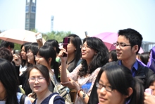 整齊的舞蹈吸引了大批同學(xué)止步觀看,現(xiàn)場(chǎng)歡呼聲不絕于耳,很多同學(xué)拿出手機(jī)拍照留影。當(dāng)舞蹈結(jié)束在指向下沉廣場(chǎng)方向的一致動(dòng)作時(shí),一個(gè)由近百把紅傘組成的60圖樣瞬時(shí)展開(kāi),同學(xué)們高聲齊喊口號(hào):“百花齊放賀工商六十華誕,萬(wàn)眾一心繪母校千秋藍(lán)圖,商學(xué)院學(xué)子祝母校甲子生日快樂(lè)!”活動(dòng)達(dá)到高潮。