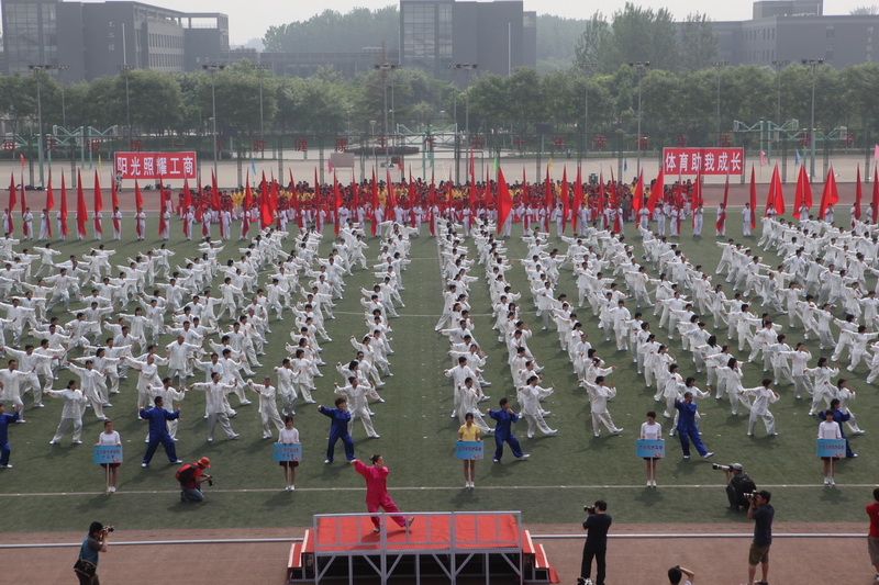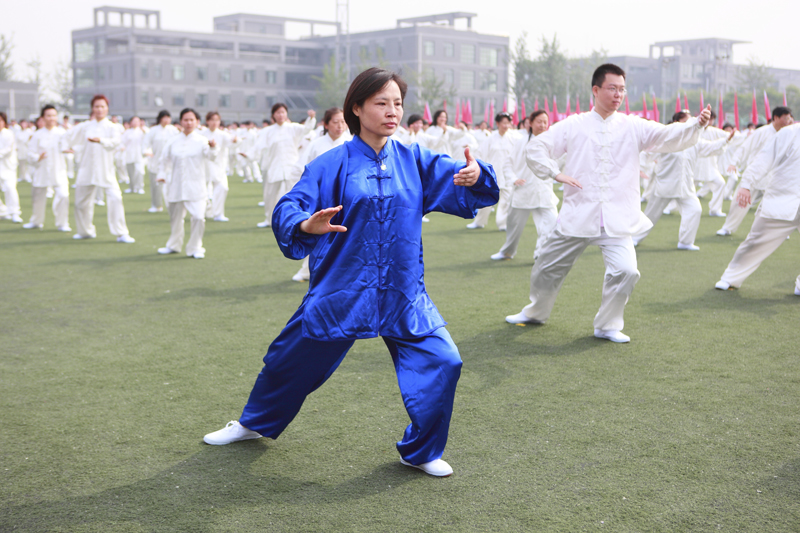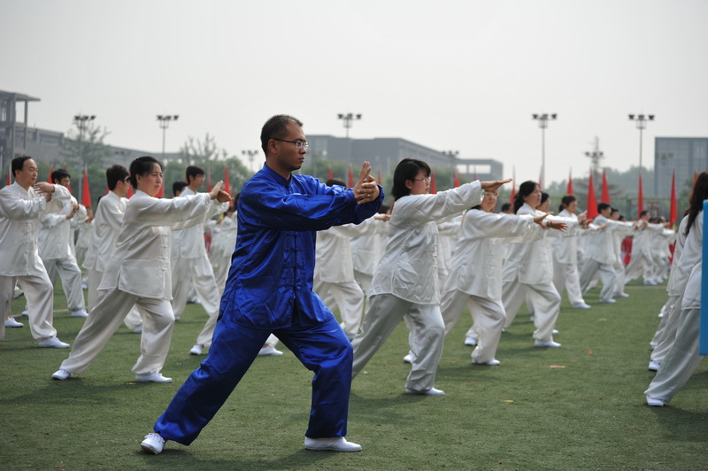 2009年國慶,我校教職工太極拳表演隊參加北京萬人太極拳表演破吉尼斯紀錄,這一太極拳傳統被傳承下來,2010年開學之初,為參加運動會的表演,各單位教職工都投入到訓練中。大家從最初的“零基礎”到能夠跟隨音樂準確做動作,再到整齊有序,這一過程中,600名老師們利用光盤模仿動作要領,找專職老師悉心指導,大家熱情高漲,訓練氣氛十分融洽,效果明顯。