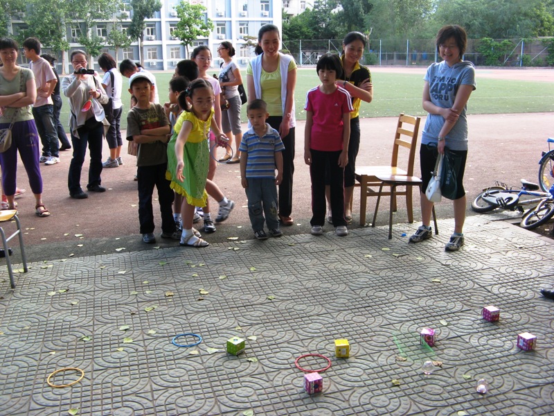 上午8點,晴空萬里,微風徐徐,70多名小朋友在父母的陪伴下來到活動現場。校工會為不同年齡階段的孩子準備了不同的游戲項目和獎品,"看誰套得牢"傳統套圈游戲、"看誰摸得準"摸鼻子游戲和"看誰轉得多"呼啦圈比賽等,讓孩子們用自己的努力贏得想要的獎品。"大家來欣賞"環節將整個活動氣氛推向高潮,孩子們踴躍登臺展示自己的才藝,小提琴獨奏、二合唱、舞蹈、背誦三字經等,贏得了家長們的陣陣掌聲。活動現場笑聲、歡呼聲響成一片,東區操場成為了一片歡樂的海洋。