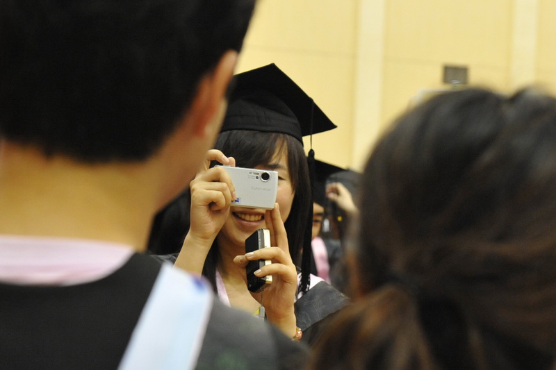 文二樓的長廊前一位同學一手拎著學士服,一手端著DV,嘴里念念有詞——他想把自己上課的地方記錄下來,配上自己的“解說詞”,作為送給自己的畢業禮物!