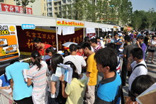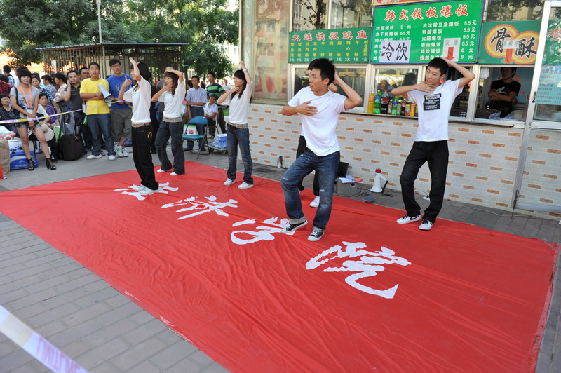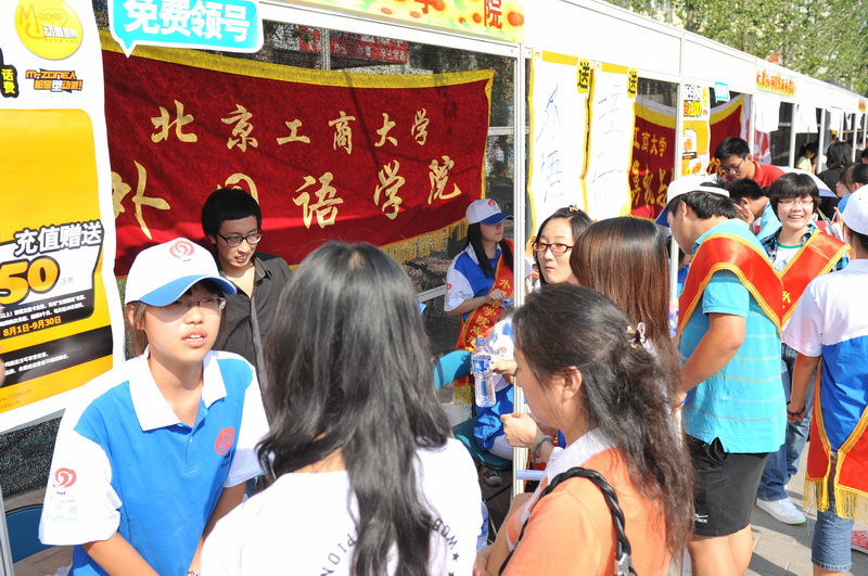 地上貼著地標,工作棚上掛著彩帶橫幅,超現代的舞蹈,以“犇騰經院”為主題的學生簽名板是本院的特色,這就是今年的經院迎新活動。對于志愿者方面,經濟學院黨總支副書記馬韜光介紹說,他們的職員工作做得比較到位,分為外圍(即校東西大門處)和內圍(即迎新主場)。外圍有60人,設了接待處以便新生和家長咨詢,內圍有90人,負責發放本院宣傳部自制的《新生手冊》,內容涉及報到流程、安排,著實方便了新生和家長。