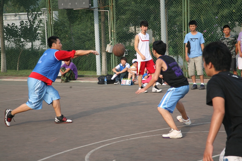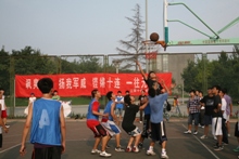 在籃球場上,參訓(xùn)學(xué)生進行了一場別開生面的籃球賽,比賽依然分為三場:一營對二營,三營對四營,五營對六營。賽前隊員都把手搭在一起吶喊:“一二,一二,嘿!”在一營對二營的比賽中,一營的一名隊員用一個假動作躲過敵人的防守巧妙地把球傳給站在籃板下的隊友,隊友伸手一投,球進了!這么默契的配合博得觀眾歡呼陣陣。三營四營的角逐尤為激烈,一名四營隊員突然突破到籃下,迅速傳球到外線,另一名隊友接球后迅速出手,三分命中!瞬間全場沸騰起來,掌聲、吶喊聲、鼓聲不斷。五營對六營的比賽中,化工學(xué)院的一名隊員突然搶到籃板下,一躍而起來了個大扣籃,現(xiàn)場掌聲連連。整個比賽各營投籃不斷,精彩不斷,拉拉隊的加油聲更是一浪蓋過一浪。