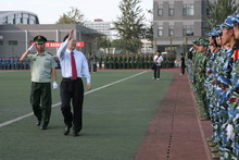 激昂的樂曲聲響起,校長譚向勇在軍訓團團長呂彥華中校的陪同下檢閱受閱方隊。譚校長向參訓學員表示親切問候,學員情緒飽滿,氣勢磅礴,“首長好!”“為人民服務!”的吶喊聲響徹云霄。