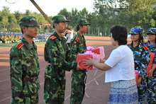 4:40匯報表演結束,呂彥華中校宣讀嘉獎令。表彰了此次軍訓中表現突出的794名優秀學員。學生代表向承訓部隊官兵代表獻花,表達對承訓部分的衷心感謝和美好祝愿。今天恰逢第26個教師節,方陣中同學們打出了“謝謝親愛的教官和老師,祝老師們節日快樂”的橫幅。溫馨場面令全場動容。