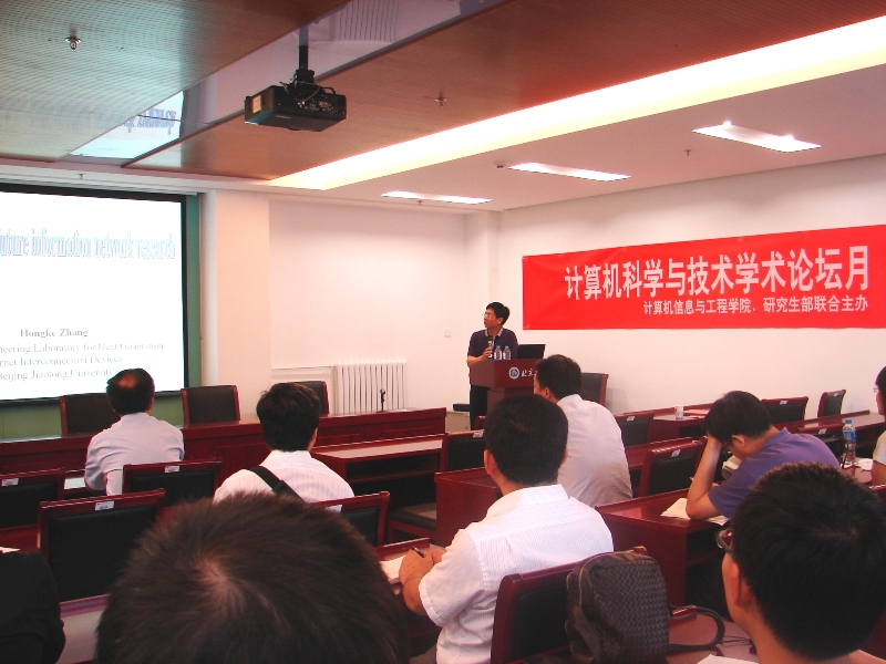 9月9日,在綜合樓二層會議室舉行了“計算機科學與技術學術論壇月”的開幕式和首場學術交流報告“信息網絡的現狀與未來”。研究生部主任何明珂教授、莫倩副教授、計算機與信息工程學院院長劉載文教授、副院長郭培源教授、左敏副教授、計算機學科帶頭人陳誼教授、計算機系主任李海生副教授、劉宏志教授以及計算機系的教師和研究生共同參加了交流活動。首場學術報告由北京交通大學下一代互聯網互聯設備國家工程實驗室主任、國家“973”項目首席科學家張宏科教授主講,報告會由計算機學科負責人陳誼教授主持。