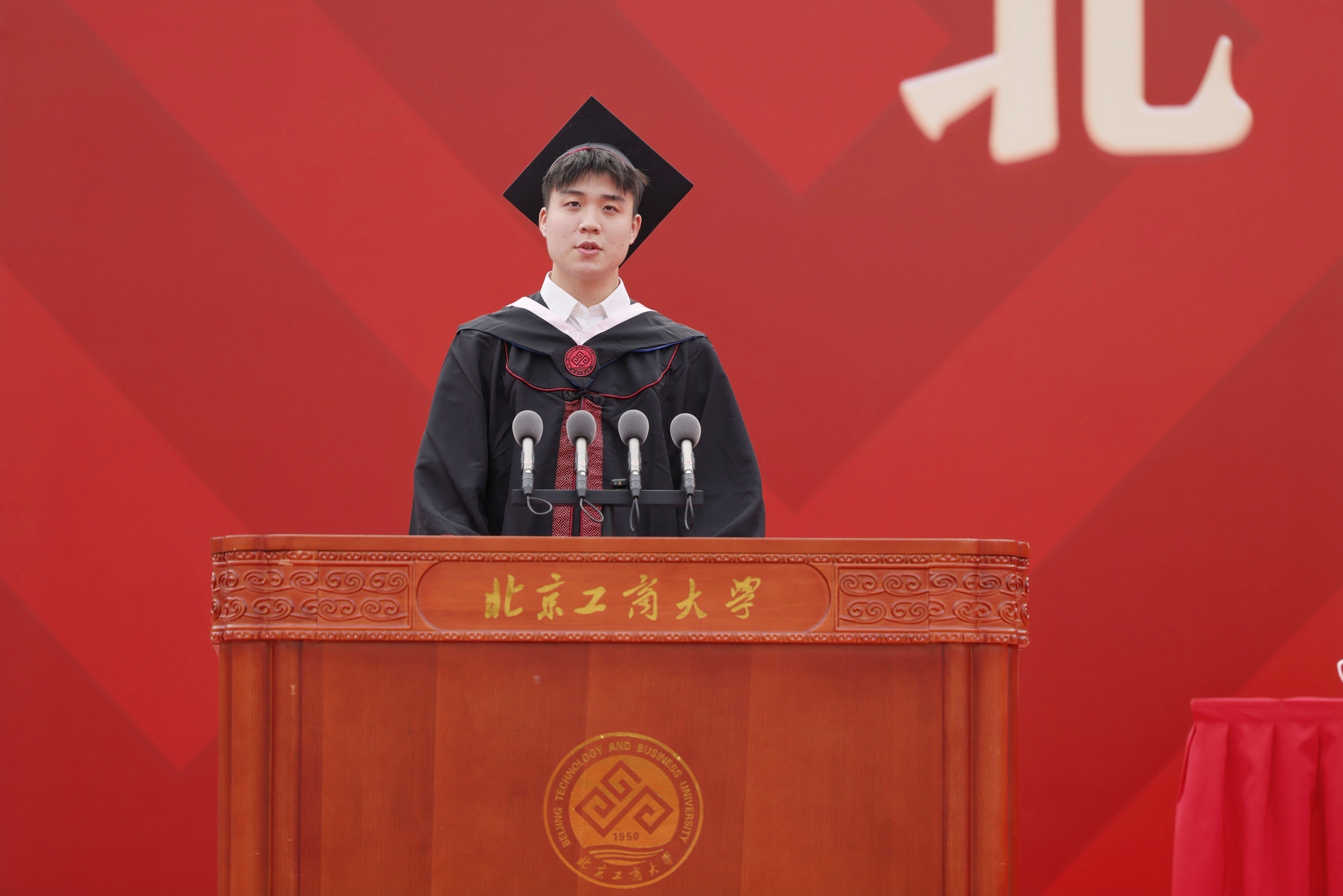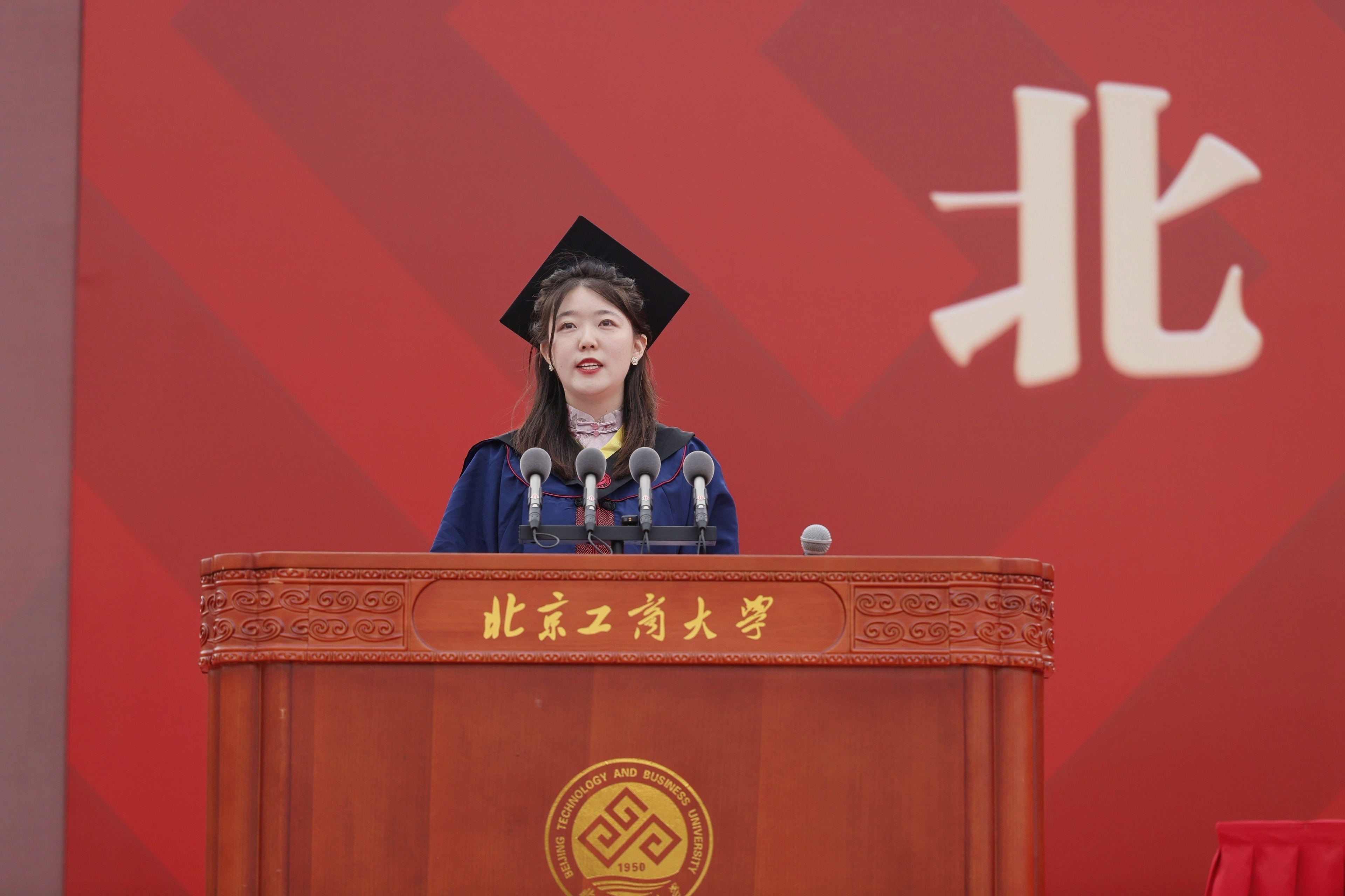研究生畢業(yè)生代表、食品與健康學院食研212班李欣萍發(fā)言。她表示,自2015年本科入學以來,她在北工商度過了九年時光,北工商見證了她的青春,她也見證了北工商的榮光。回望過去,在北工商學習生活的一點一滴都還歷歷在目,北工商的每一個角落都記錄著她和同學們的奮斗和成長。入學時的興奮或許已經(jīng)模糊在北工商努力的日夜卻依然清晰。在畢業(yè)來臨之際,她衷心祝愿母校風華正茂、永續(xù)華章;祝愿老師工作順利、桃李滿疆;祝愿所有的同學一帆風順、一路繁花,秉承“求真、立德、勤奮、創(chuàng)新”的校訓,以青春“小我”書寫強國“大我”。