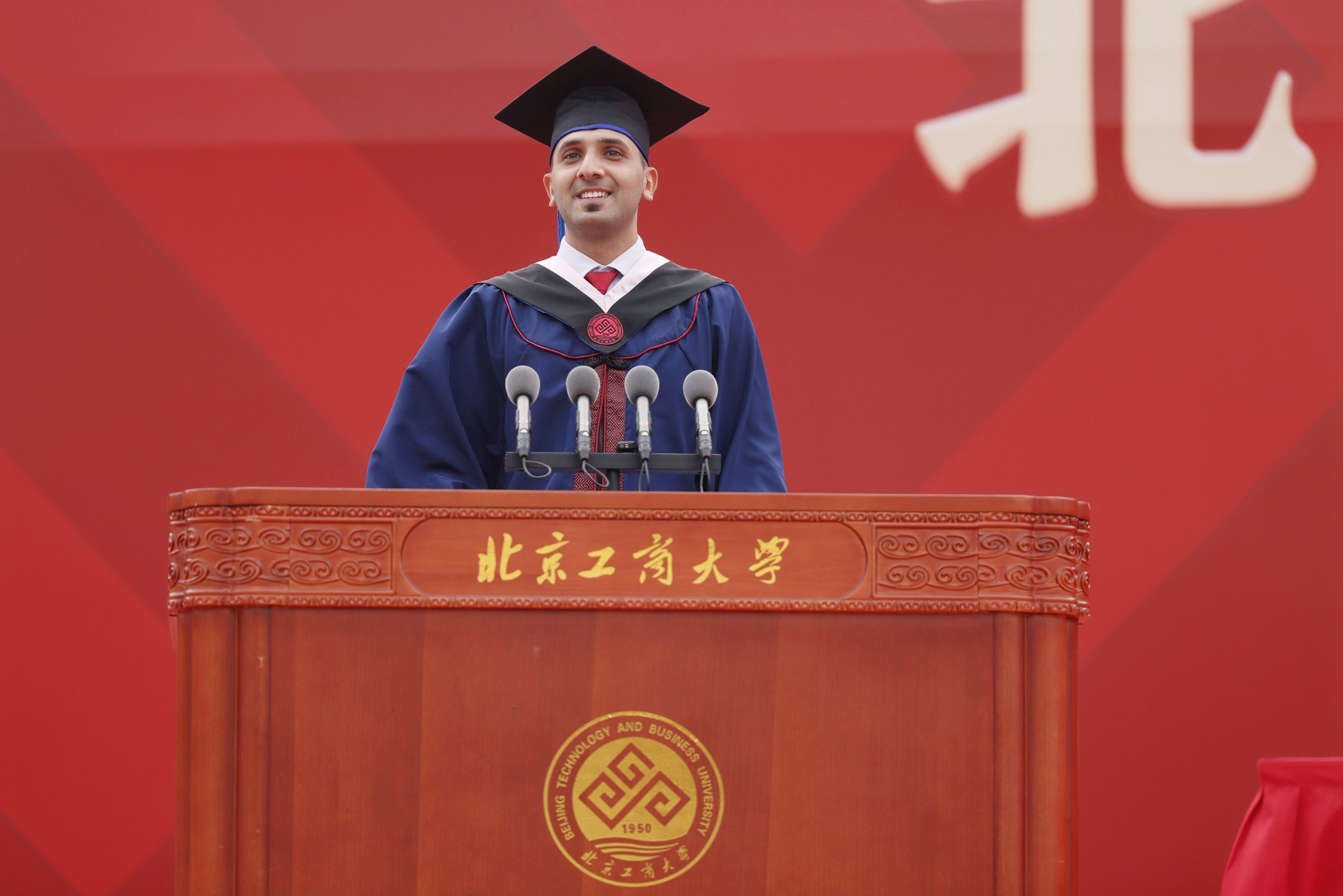 回顧求學之旅,留學畢業(yè)生代表Jad表達了自己與其他留學生對北工商衷心的感謝和深深的祝福。他要感謝中國政府給予他與其他留學生來華學習的機會,為他們打開了認識中國、認識世界的窗口;感謝北工商為他們提供了學習和實踐的平臺,讓他們學習了前沿知識,提升了專業(yè)技能,探索了發(fā)展方向;他要感謝在北工商的同窗朋友,友情讓他在北工商的生活充實而多彩。他祝愿北工商走向國際一流,祝愿老師同學萬事順意,希望世界能永遠充滿愛與和平。