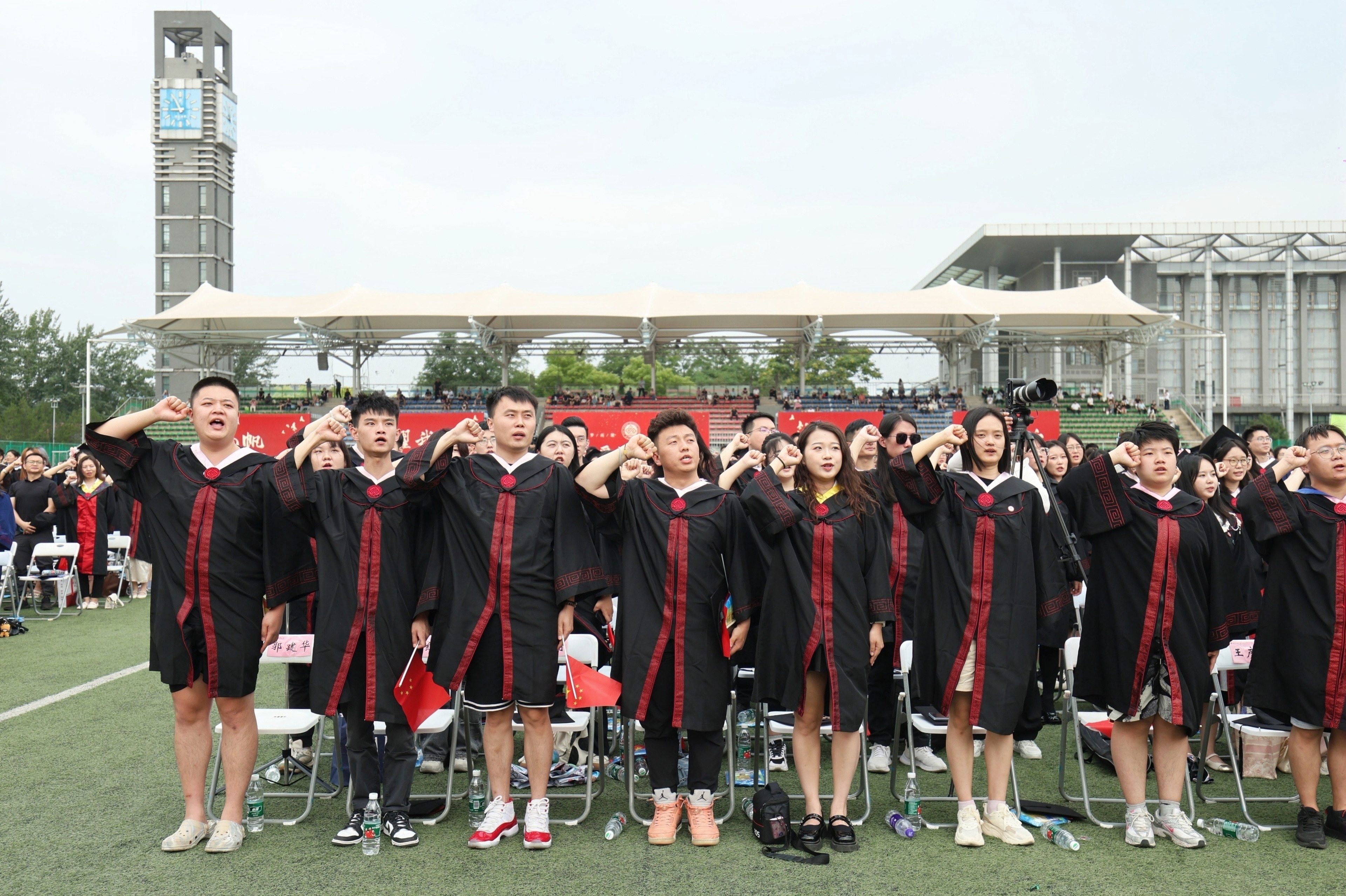 優(yōu)秀畢業(yè)生代表發(fā)言完畢后,全體畢業(yè)生起立,高舉右拳齊聲宣誓。畢業(yè)生將銘記工商校訓,感念母校師恩,賡續(xù)紅色基因,奉獻祖國人民,勇?lián)鷷r代使命,無憾盛世青春,自強自信自尊,創(chuàng)業(yè)創(chuàng)造創(chuàng)新。揚帆遠航,耀我工商!鴻鵠萬里,國之棟梁!為國家繁榮昌盛,為民族偉大復興,貢獻畢生力量。
