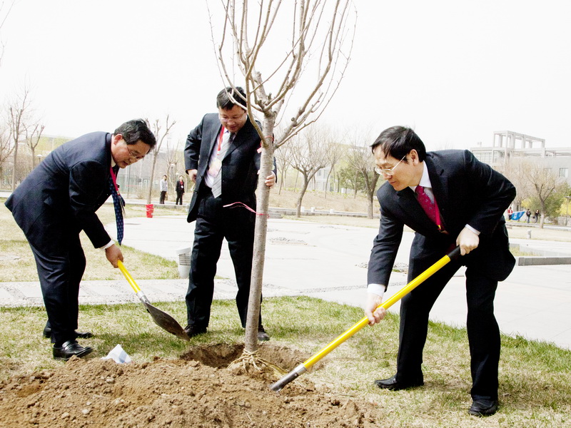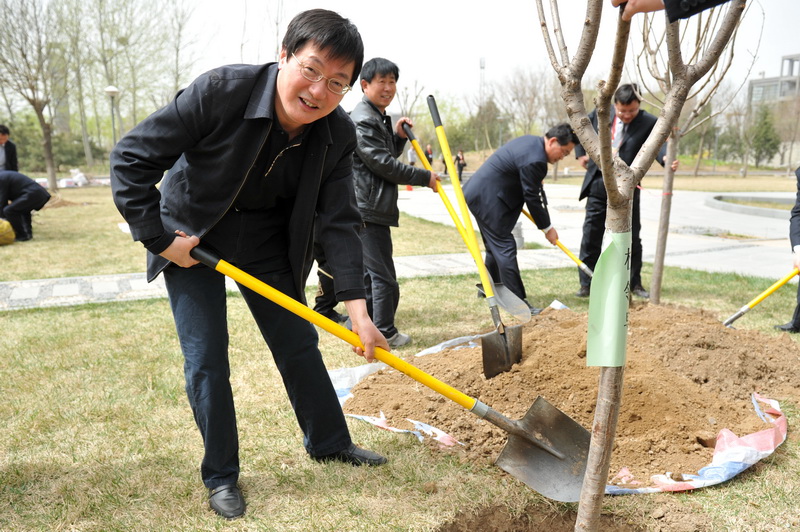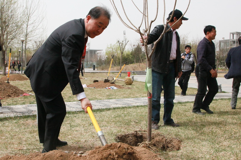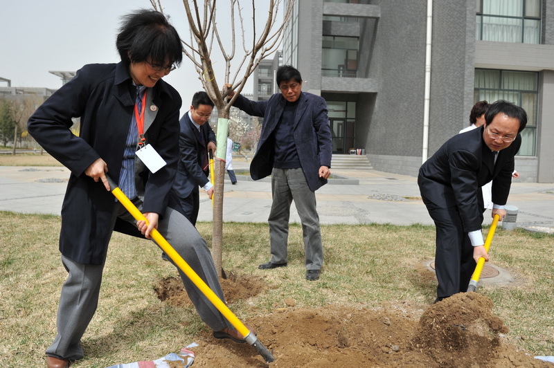 4月9日中午,春光明媚,萬物復蘇。參加完“雙代會”開幕式的代表們來到良鄉校區文科二、三號樓西側的綠地,親手種下了櫻花26棵、移植海棠5棵;為游泳館、科研樓南側綠地銀杏樹培土22棵。
