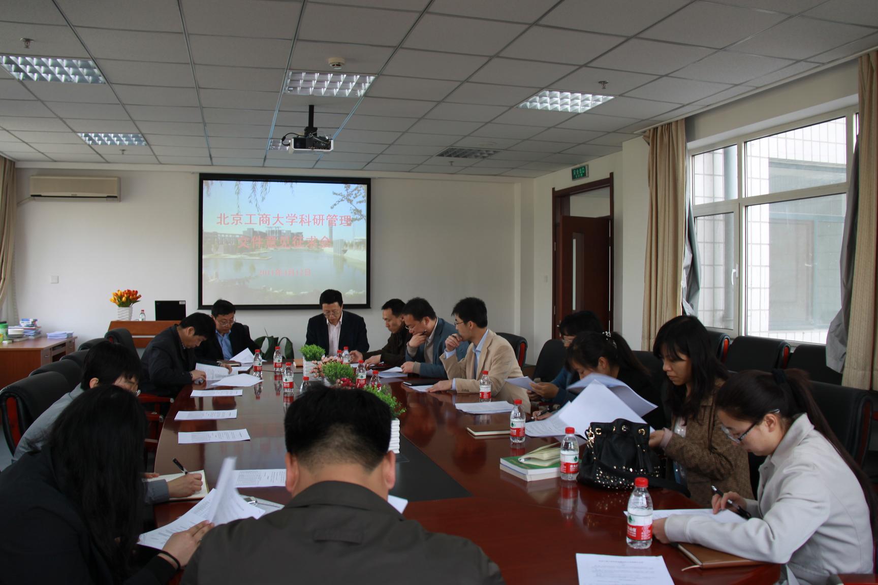 4月12日下午,我校在阜成路校區召開2011年度科研管理文件修訂意見征求會,會議由科學技術處王小藝副處長和孫永波副處長主持,來自理學院、食品學院、材料與機械工程學院、計算機與信息工程學院、經濟學院、商學院、法學院、外國語學院、藝術與傳媒學院、體育與藝術教學部、文科實踐中心的主管科研負責人、教授代表、副教授代表、講師代表參加了本次會議。