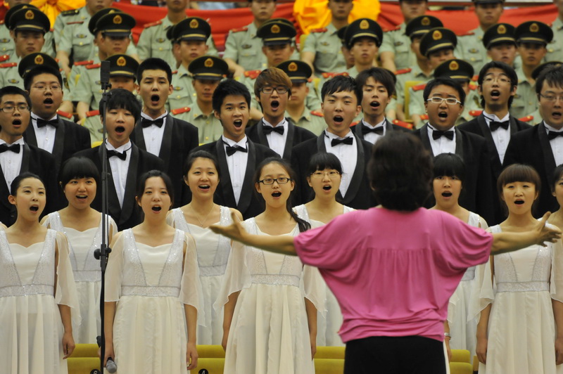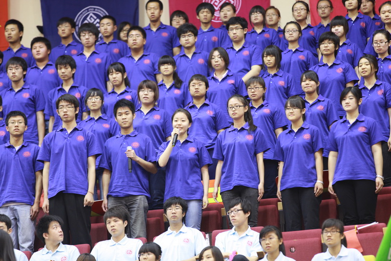 身著綠色服裝的同學們,以一首熱情洋溢、慷慨激昂的《我們走在大路上》唱出了他們的心聲,“我們走在大路上,意氣風發斗志昂揚……”。隨后,一曲《大海啊故鄉》旋律流暢舒展,優美動聽,節奏嚴謹。歌曲的最后,他們還擺出紅色的“90”字樣,為建黨90周年獻禮。