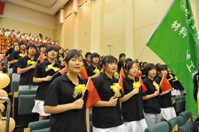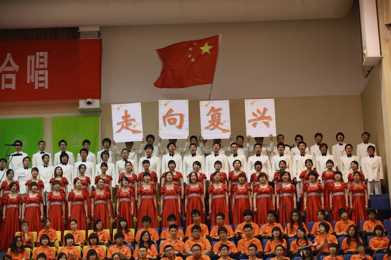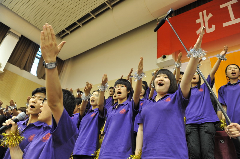 《沒有共產黨就沒有新中國》,同學們以飽滿的熱情唱出了黨在國家建立及發展中的重要作用。接著又以陣陣鼓聲引出《愛我中華》,活潑的曲調,跳躍的節奏,伴著有力的鼓點,調動了全場的氣氛。“愛我中華,愛我北工商”的標語、口號,更是將大家的熱情推向高潮。