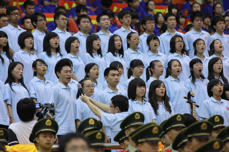 “堅決不做亡國奴,打倒帝國主義”的洪亮口號,響徹全場。同學們手中的翻花,隨著音樂變換出多種圖案,分別拼出了黨旗和國旗。《畢業歌》中的那句“同學們!同學們!快拿出力量,擔負起天下的興亡”振奮人心。《我和我的祖國》唱出了情系祖國的真情。
