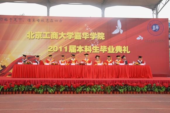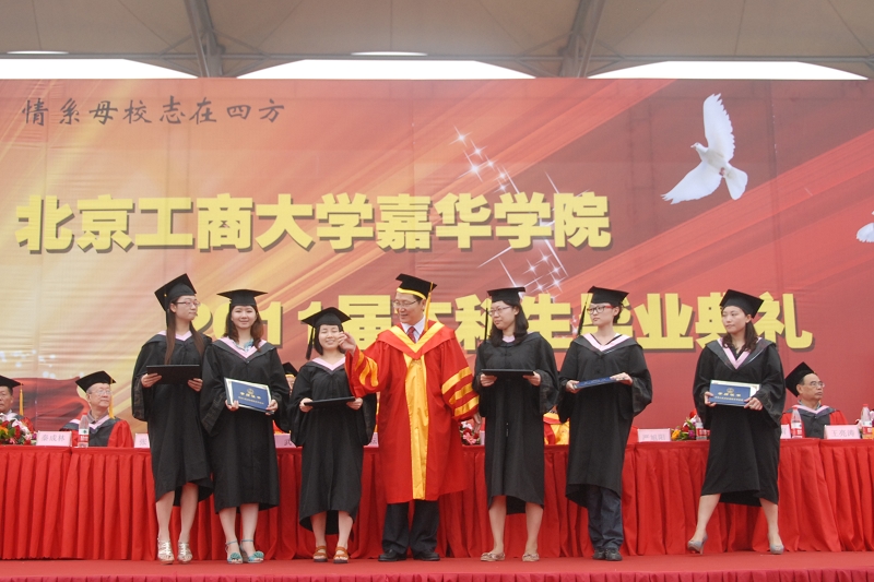6月29日上午,譚向勇校長出席嘉華學院2011屆本科生畢業典禮,向獲獎畢業生及畢業班代表頒發了榮譽證書、畢業證及學位證書。北京工商大學副校長、嘉華學院院長張耘、嘉華學院相關領導及各系部主任與1300多名畢業生參加了此次典禮。