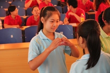 上午8點35分,由實踐團成員鄭岑主講的話劇基礎培訓課在階梯教室準時開課。盡管這是長溝中學的孩子們第一次接受與話劇有關的輔導培訓,但是我們可以明顯地感受到他們對于話劇的濃厚興趣。當鄭岑向大家提問“聽到‘話劇’這個詞的第一感覺”時,孩子們紛紛舉手發言,給出了“優美”、“要通過大家的齊心協力來完成”等令人滿意的答案。