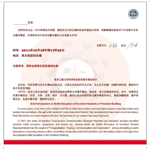 繼9月9日舉辦教學(xué)優(yōu)秀獎教師冷餐會、9月28日舉辦科研優(yōu)秀教師冷餐會后,10月18日晚,學(xué)校在良鄉(xiāng)校區(qū)舉行2011年校長樓冷餐會系列之三——“優(yōu)秀學(xué)生代表校長樓冷餐會”,冷餐會主題為“祝賀、分享、交流、期許”。50名在學(xué)業(yè)、科研、文體、社會工作等領(lǐng)域取得優(yōu)異成績的學(xué)生代表受邀參加(名單附后)。校領(lǐng)導(dǎo)孫堯東、譚向勇、盧思鋒及有關(guān)職能部門負(fù)責(zé)人出席冷餐會,學(xué)校以這種高雅新穎的形式對取得突出業(yè)績的優(yōu)秀學(xué)生給予肯定和表彰。