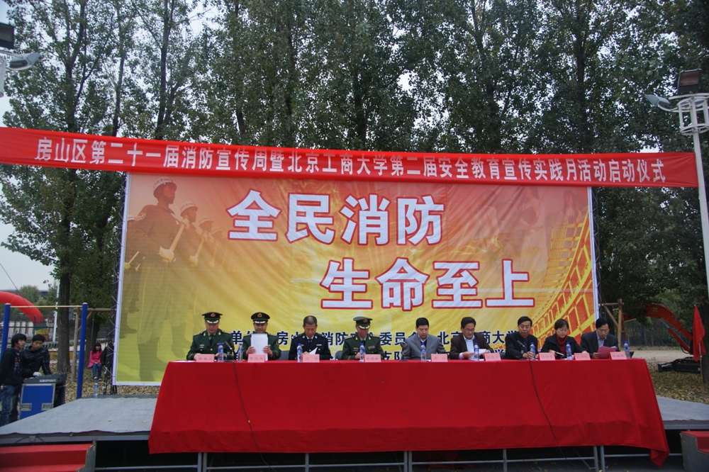 11月2日下午,房山區防火安全委員會和北京工商大學共同主辦“房山區第二十一屆119消防宣傳周”暨“北京工商大學第二屆安全宣傳教育實踐月活動啟動儀式”,并在良鄉校區生活區南門外操場組織大一新生及學校教職工進行了大型的消防疏散演習。北京工商大學黨委副書記張德玉、房山區副區長李江、北京市消防總隊參謀長李建春、房山區公安分局副局長閆偉、房山區“三化兩區”建設咨詢委員會副主任委員高培軍、房山區消防支隊政委藏桂叢、房山區公安消防支隊長李立志等領導出席了活動。