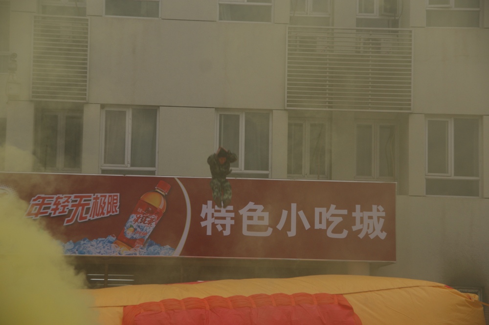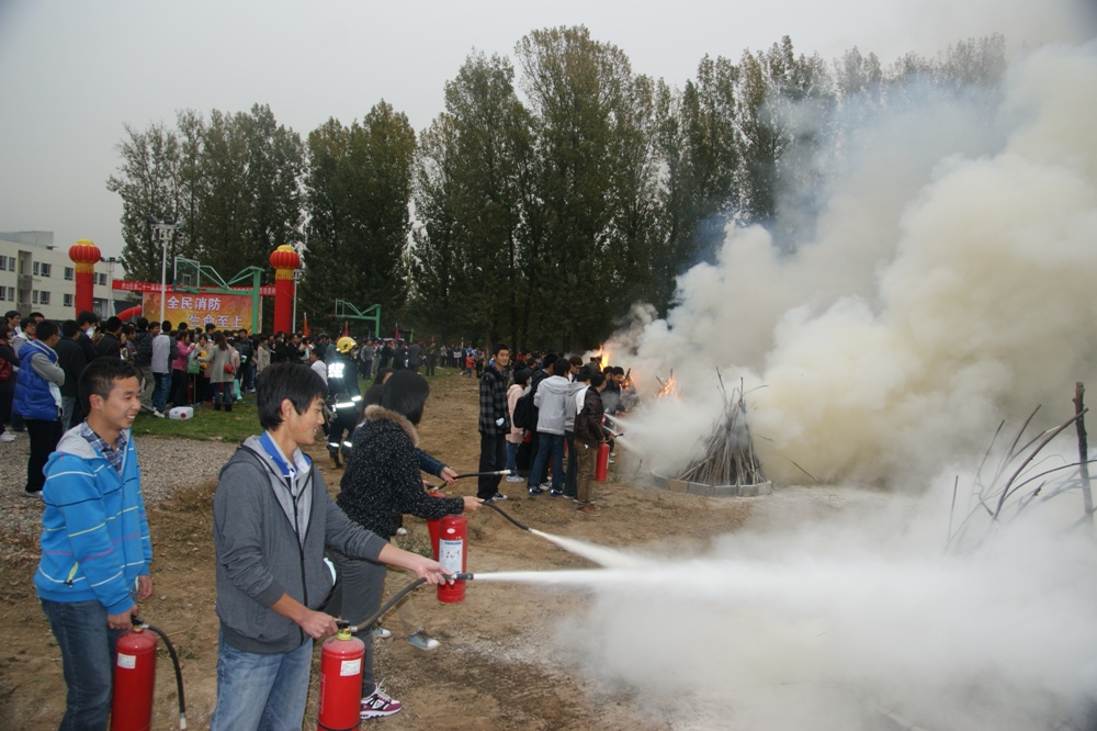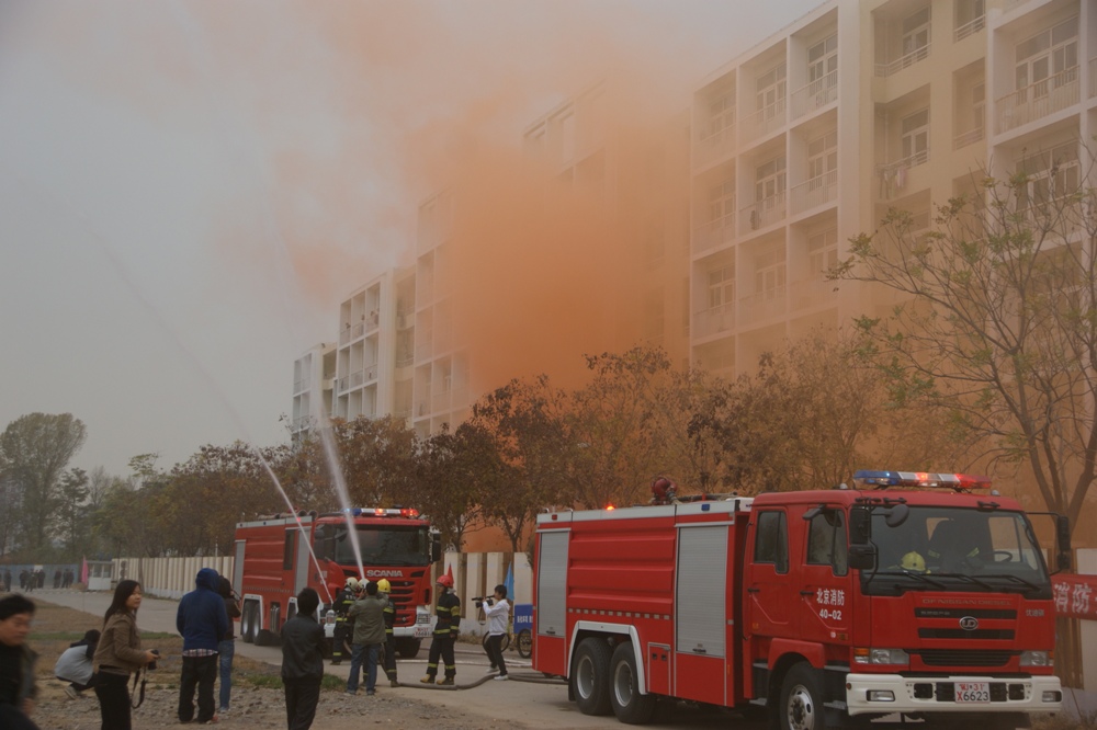 14:30分,消防演習開始。警報長鳴,煙霧滾滾,700余名大一新生有秩序地從煙霧中穿過。模擬現場非常逼真,給人以身臨其境的感覺。保安人員現場模擬了火場救護,消防戰士演示了跳躍氣墊逃生,消防車進行了滅火演示。之后,參演學生在生活區操場集合,觀看消防戰士穿戴戰斗服的演練,在現場的學生也進行了試穿戰斗服的體驗,然后由消防官兵現場講解了滅火器的使用方法后,兩百余名師生員工在十個模擬火情現場,親身體驗了滅火器的使用和滅火的方法,最后,保安人員用消防水帶將火徹底撲滅。