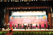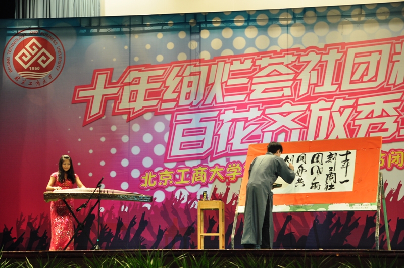 伴隨著街舞社激情飛揚的開場舞,晚會正式拉開序幕。來自我校各社團的17個節(jié)目依次出場,展示了他們的風采。激揚的青春、絢爛的夢想在此刻上演。BTBU吉他社用其充滿夢想與激情的樂隊演奏向觀眾們展示了原創(chuàng)音樂的力量;來自雪域鍋莊社的二十名藏族同學身著華麗的藏服,踏著《洗衣歌》輕松歡快的節(jié)奏,為觀眾們帶來了展現(xiàn)民族風采的鍋莊舞;武術協(xié)會則以剛?cè)岵Q道,干凈利落的武術動作,精彩的雙截棍和跆拳道表演迎得了在場師生們的陣陣掌聲;魔術社充滿神秘氣息的魔術表演更是將現(xiàn)場氣氛逐步推向高潮;書法社現(xiàn)場書寫了“十年一刻工商社團風雨同舟 共創(chuàng)輝煌”以表達對學校社團文化節(jié)的祝愿;詩朗誦《十年一刻》總結(jié)了社團文化節(jié)走過的十年歷程,同時強調(diào)了學校對社團支持、服務、管理的理念。此外,我校愛樂協(xié)會、天文社、手語社、輪滑社、B-BOX等社團的精彩表演也贏得了現(xiàn)場觀眾的陣陣歡呼與掌聲。我校團委書記呂良老師、副書記郭新愿老師還在現(xiàn)場抽取了幸運觀眾42名,并贈送了紀念品。最終,晚會在社團文體部歡快的舞蹈中完美落幕,第十屆社團文化節(jié)至此畫上圓滿句號。
