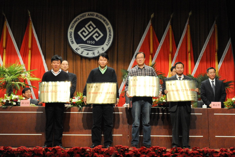 孫寶國副校長宣讀了省部級獎勵、國家級項目立項、省部級項目立項和北京工商大學2011年科學研究優秀成果獎名單獲獎單位及人員名單,李朝鮮副校長宣讀了個人科研排名前10名、科研單位完成工作量總分排名前3名、科研管理先進單位、科研管理先進個人、科協工作先進個人的名單(名單另發)。校領導為獲獎單位代表和個人頒發了榮譽證書和獎牌。