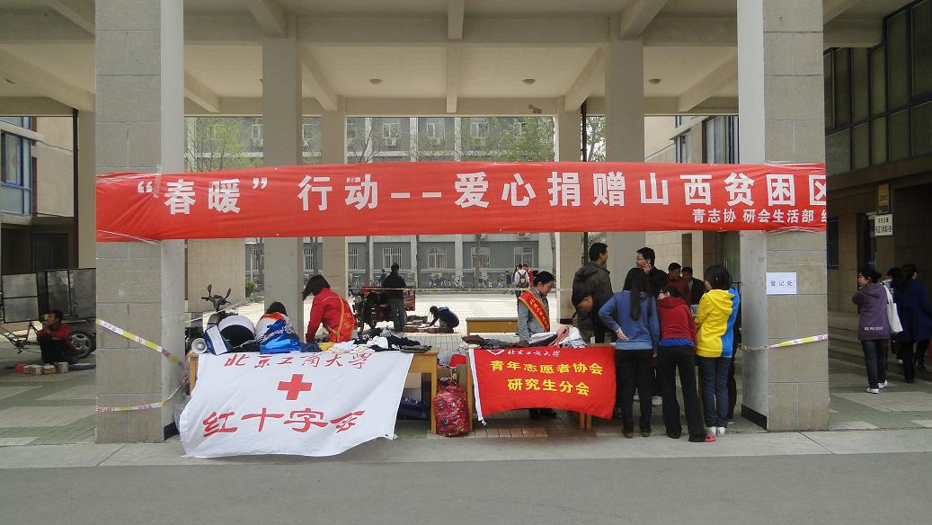 為發(fā)揚(yáng)助人為樂、扶貧濟(jì)困的優(yōu)良傳統(tǒng),4月9日上午,由研究生青年志愿者協(xié)會分會發(fā)起,研究生會生活部、校紅十字會協(xié)辦的“春暖行動——愛心捐贈山西永和縣貧困地區(qū)活動”在我校阜成路東校區(qū)雙子樓下展開。