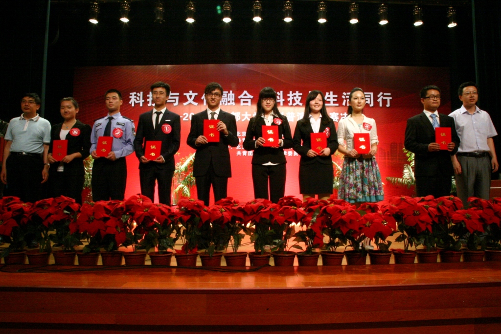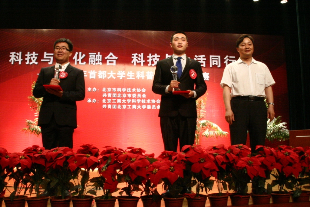 北京工商大學(xué)科技處副處長錢立軍為優(yōu)秀組織個人獎頒獎;北京工商大學(xué)團委書記呂良為優(yōu)秀組織獎的學(xué)校頒發(fā)了獎牌;北京工商大學(xué)校辦主任王小藝、科技處處長楊有紅為獲得三等獎的選手頒發(fā)證書;北京市科協(xié)咨詢中心主任何素興為獲得二等獎的選手頒發(fā)榮譽證書;北京工商大學(xué)副校長方德英為獲得本次比賽一等獎的2名演講者頒發(fā)了獎杯。